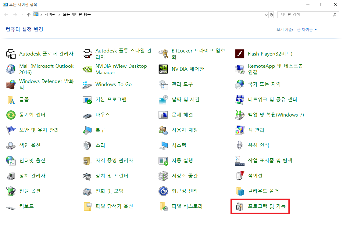 제어판에 프로그램 또는 프로그램 및 기능으로 이동합니다.
