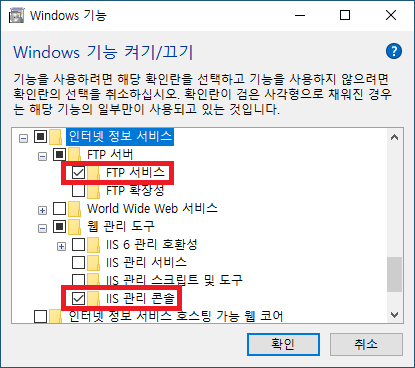 Windows 기능 켜기/끄기창에서 위 그림과 같이 FTP 서비스와 IIS 관리 콘솔을 체크 하고 확인 버튼을 클릭합니다.