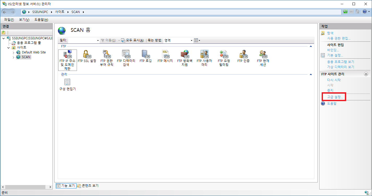 방금 생성한 SCAN이라는 FTP 서버를 클릭하여 FTP 사이트 관리에서 고급 설정을 클릭합니다.