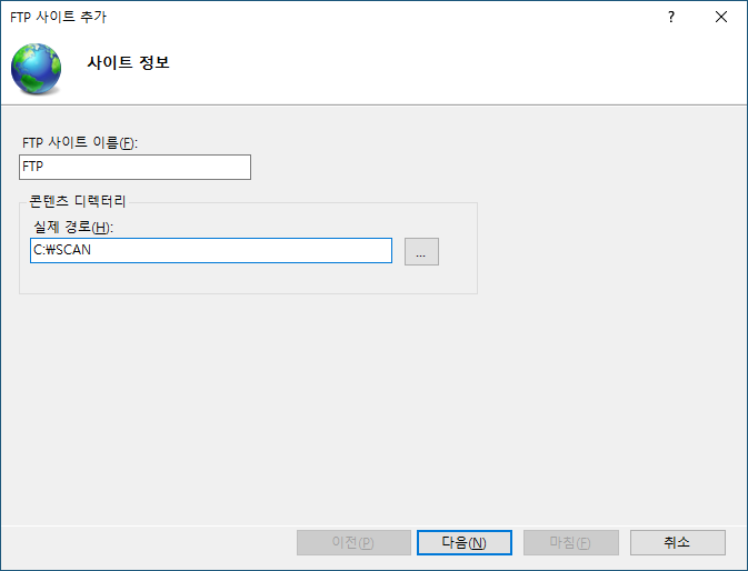 원하는 FTP 이름과 경로를 설정합니다. 저는 C드라이브 밑에 SCAN이라는 폴더를 만들었습니다.