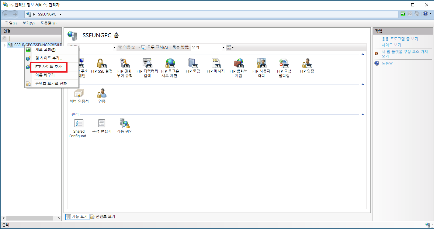 좌측에 PC이름에서 마우스 오른쪽 버튼을 클릭하여 FTP 사이트 추가를 클릭합니다.