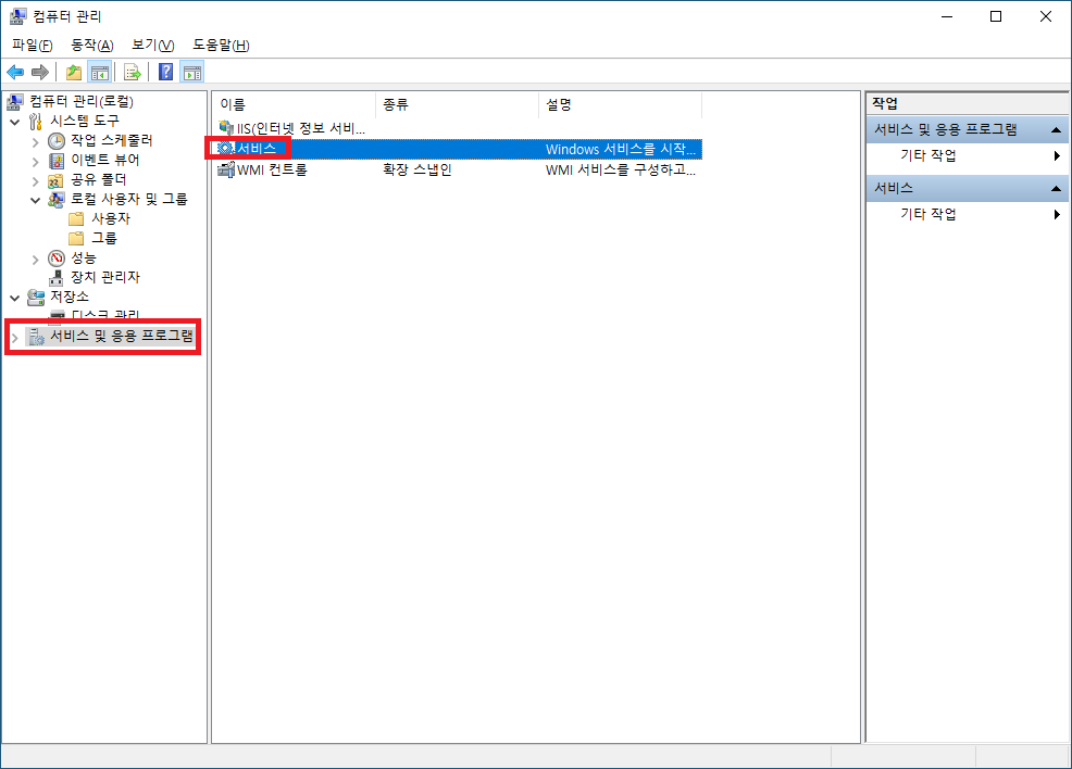 컴퓨터 관리에서 서비스 및 응용 프로그램으로 이동한 후, 서비스를 실행합니다.